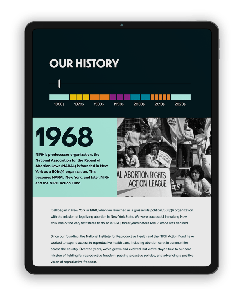 Creative directing & sole UI/UX designer on a dual-site redesign over 2 years. Components based, modular, responsive design, with a net new visual UI look and a 200+ tagged image library of inclusivity. Making critical changes following the Roe v. Wade overturning days before launch. Designed to inspire action in reproductive rights, maternal care & abortion access.