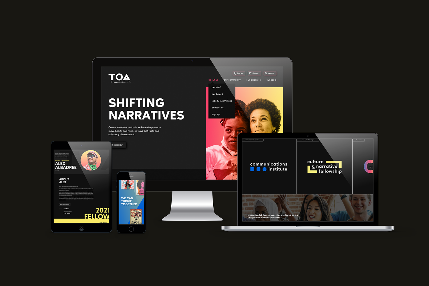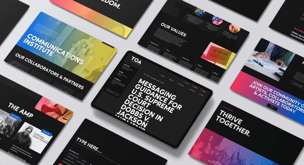 Digital creative directing – UI/UX direction, design & development of the “TOA” Opportunity Agenda website redesign and new IA structure. An entirely dark mode design aligned with advocacy narrative and GenZ audience including a cutting edge search, TikTok/Twitter embeds and mobile-first content calendar.